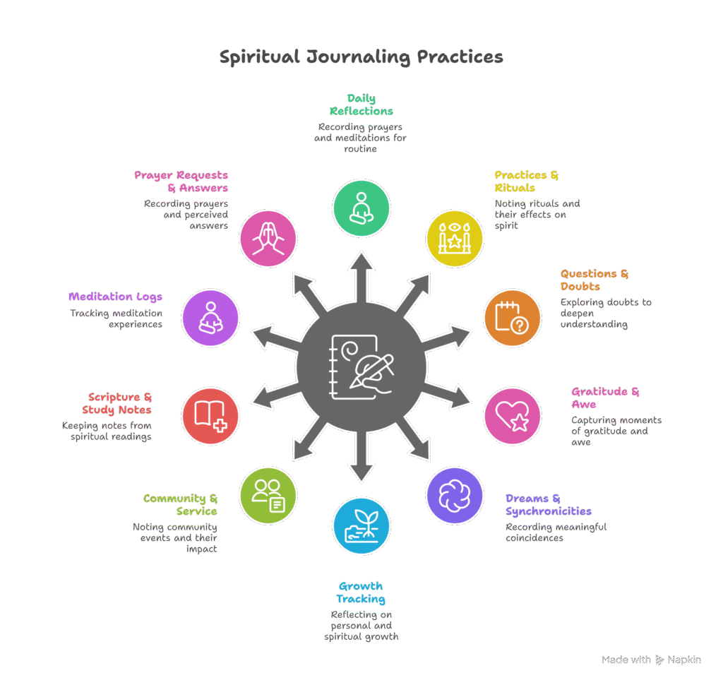 Spiritual journals document inner experiences, revelations, and practices that shape one’s faith or spiritual life. They provide a safe space for exploration without judgment and encourage consistent spiritual discipline.