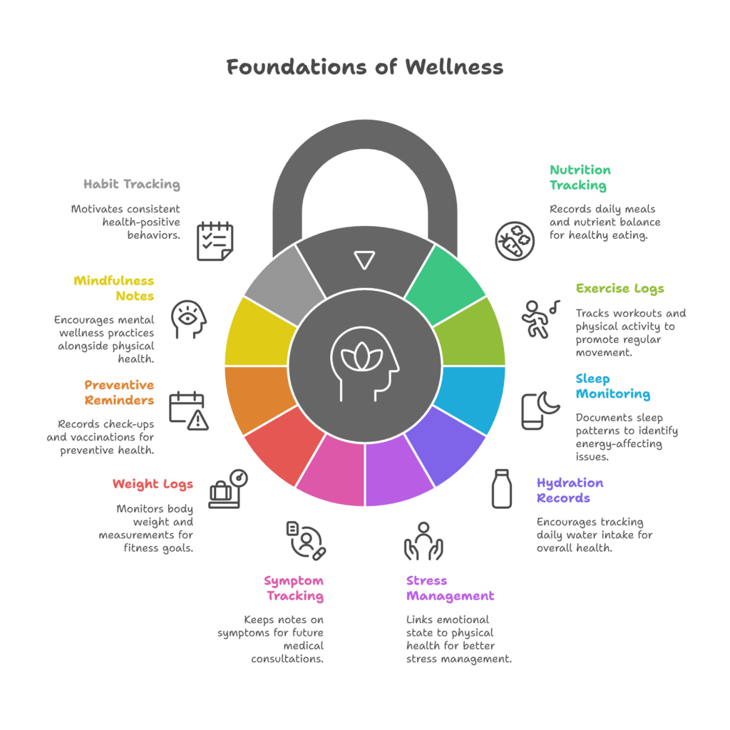 Wellness diaries focus on balanced living through consistent tracking of diet, exercise, sleep, and stress management. They serve as a personal health record and motivational guide.
